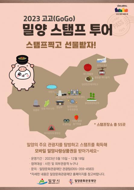 (밀양=연합뉴스) 이정훈 기자 = 경남 밀양시와 밀양문화관광재단은 '2023 밀양방문의 해'를 맞아 다른 지역 관광객을 대상으로 '고고(GoGo) 밀양 스탬프 투어'를 시작했다고 17일 밝혔다.