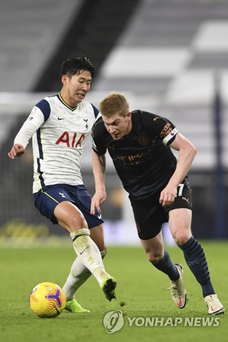 | ▲ In this Associated Press photo, Son Heung-min of Tottenham Hotspur (L) tries to defend Kevin De Bruyne of Manchester City during their Premier League match at Tottenham Hotspur Stadium in London on Nov. 21, 2020. (Yonhap) |
