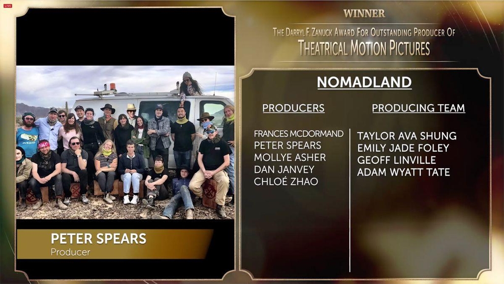 '노매드랜드'는 24일(현지시간) 제32회 PGA 시상식에서 작품상인 '대릴 F. 재넉 극영화 우수제작자상'을 받았다고 미국 연예 전문 매체 버라이어티 등이 보도했다.