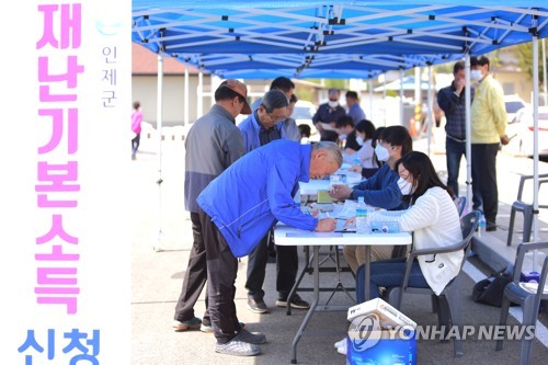 | ▲ 인제 재난 기본소득 (인제=연합뉴스) 강원 인제군의 재난 기본소득 지급이 시작된 7일 '마을별 찾아가는 신청 창구'에서 주민들이 1인당 20만원의 인제사랑상품권을 수령하고 있다. 2020.5.7 [인제군 제공.재판매 및 DB 금지] jlee@yna.co.kr |