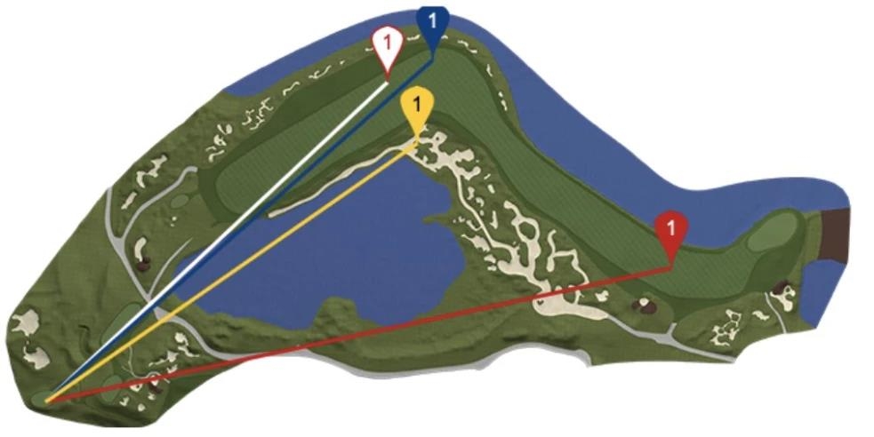 핀 방향을 바로 본 듯 아예 오른쪽을 향해 선 뒤 힘껏 휘둘렀고, 공은 물과 그 앞의 벙커를 훌쩍 지나 그린을 얼마 남겨두지 않은 페어웨이 중앙에 떨어졌다.