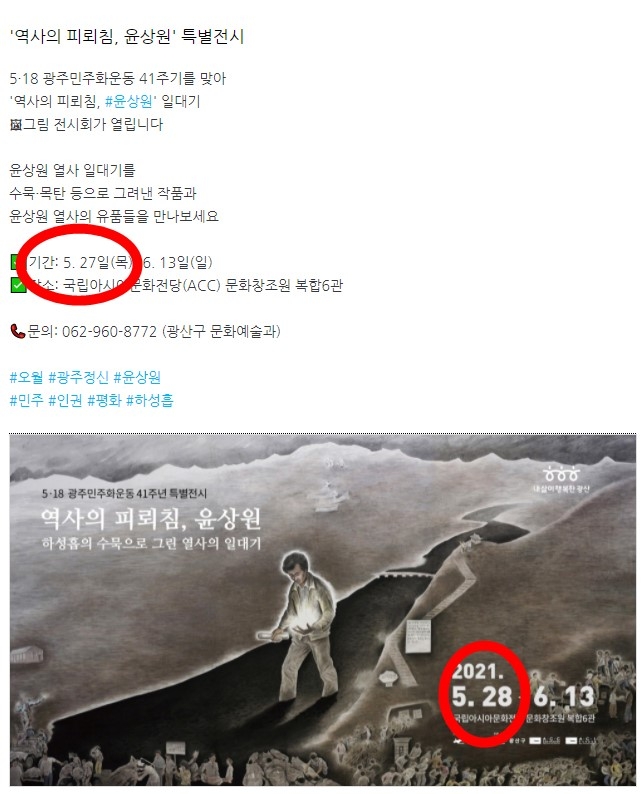 | ▲ 윤상원 그림전, 27일부터로 안내한 홍보물(왼쪽)과 28일부터로 안내한 팻말(오른쪽) [연합뉴스 사진] |
