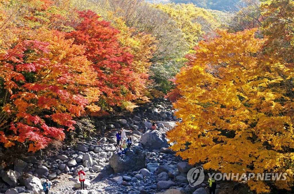 | ▲ 한라산 천아계곡 단풍[연합뉴스 자료사진] 지난해 10월 30일 오전 제주시 무수천 상류 천아계곡을 찾은 탐방객들이 울긋불긋 예쁘게 물든 단풍을 감상하고 있다. |