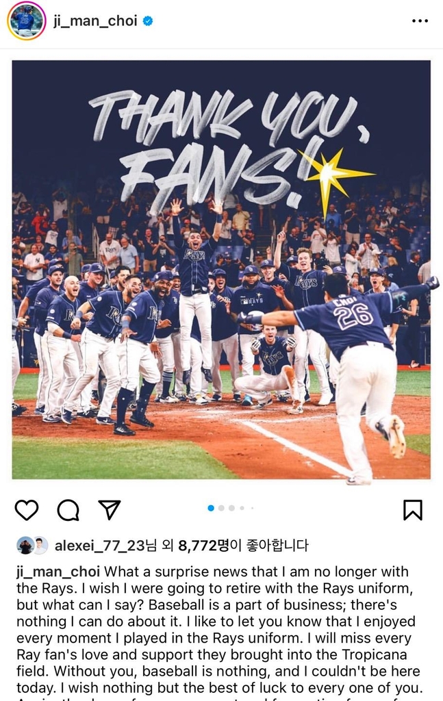 | ▲ SNS에 탬파베이 팬들에게 작별 인사를 남긴 최지만 [최지만 SNS 캡처. 재판매 및 DB 금지] |