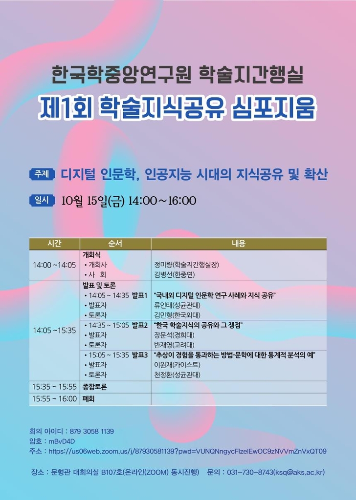 심포지엄은 온라인으로 진행된다. 한중연은 매년 학술지식 공유 심포지엄을 개최할 계획이다.