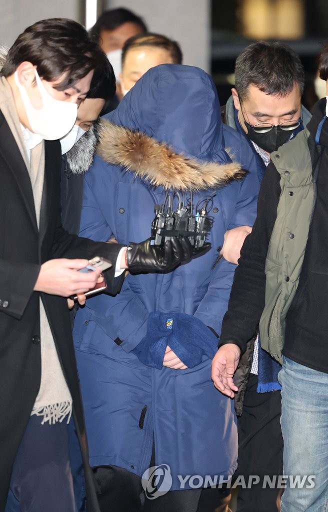 | ▲ An employee of dental implant maker Osstem Implant Co., only identified by his surname Lee, is taken into Gangseo Police Station in Seoul on Jan. 6, 2022, after police arrested him in Paju, 30 kilometers north of Seoul, the previous day for allegedly misappropriating 188 billion won (US$157.7 million) of the company's funds. (Yonhap) |