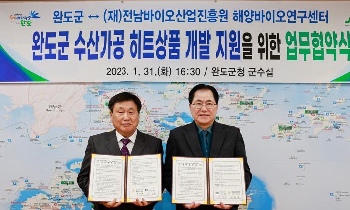 (완도=연합뉴스) 조근영 기자 = 전남 완도군은 1일 (재)전남바이오산업진흥원 해양바이오연구센터와 완도 대표 수산가공 히트상품 개발 사업 추진을 위한 업무 협약식을 했다고 밝혔다.