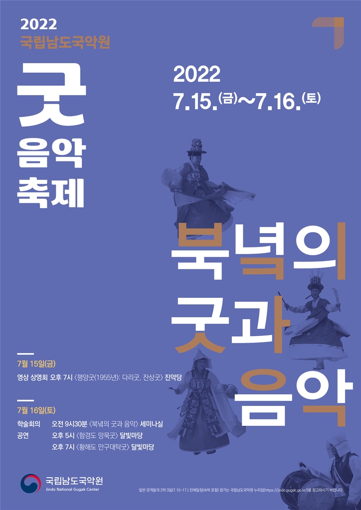 (서울=연합뉴스) 임지우 기자 = ▲ 국립남도국악원 '2022 굿음악축제-북녘의 굿과 음악' = 국립남도국악원이 다음 달 15∼17일에 전남 진도군 국립남도국악원 일대에서 '2022 굿음악축제-북녘의 굿과 음악'을 연다.
