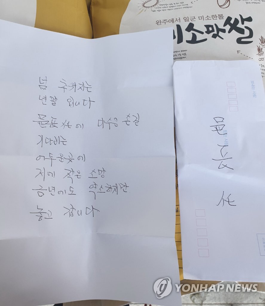 신원을 밝히지 않은 이 독지가는 쌀과 함께 손편지도 남겼다.