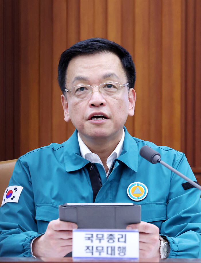 Acting President Choi Sang-mok, who concurrently serves as deputy prime minister for economic affairs and finance minister, speaks during a meeting of the National Terrorism Countermeasure Committee at the government complex in Seoul on March 7, 2025. (Pool photo) (Yonhap)