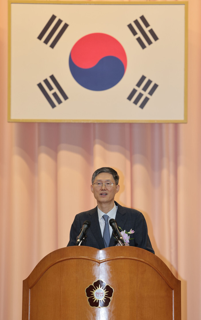Moon Hyung-bae, outgoing acting chief of the Constitutional Court, attends a ceremony at the court in Seoul on April 18, 2025, to mark his departure from his post. (Yonhap)