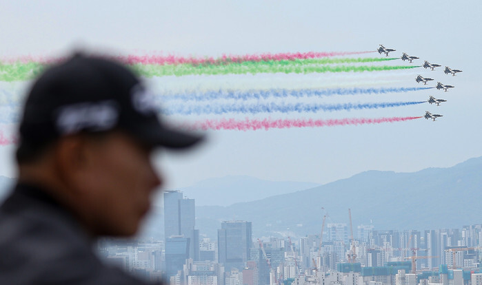 The Air Force's Black Eagles aerobatic team stages a practice flight with colored smoke trails over central Seoul on May 25, 2024, ahead of its commemorative flight next week to mark the state visit of United Arab Emirates President Mohammed bin Zayed Al Nahyan. (Yonhap)