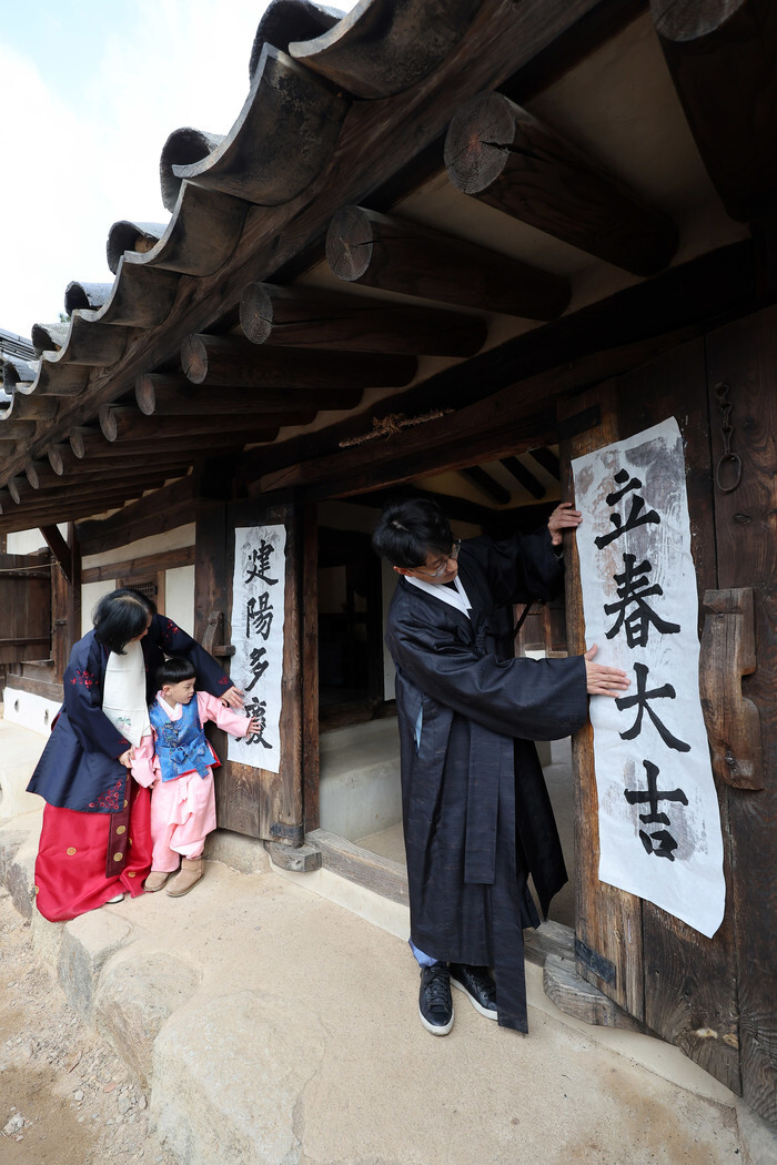 A family attaches sheets of paper with springtime blessings written in Chinese characters to the gate of a traditional house, hanok, at the National Folk Museum of Korea in Seoul on Feb. 2, 2023, two days ahead of the day of "Ipchun," one of the 24 seasonal divisions of the calendar that marks the onset of spring. The banner on the right reads "Ipchun Daegil," meaning "Good luck on Ipchun," and the other one on the left reads "Geonyang Dagyeong," meaning "With signs of a positive spirit, your family is full of happiness." (Yonhap)