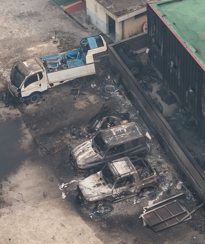 This photo, taken March 26, 2025, shows burnt-out vehicles at a destroyed garage in Yeongdeok, North Gyeongsang Province, southeastern South Korea, after it was engulfed by a wildfire the previous day. (Yonhap)