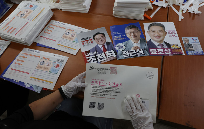 An official at the election commission office in Seoul's Dongdaemun Ward works on sending election campaign materials on Oct. 5, 2024, ahead of the Oct. 16 by-election to pick the superintendent of the Seoul Metropolitan Office of Education. (Yonhap)