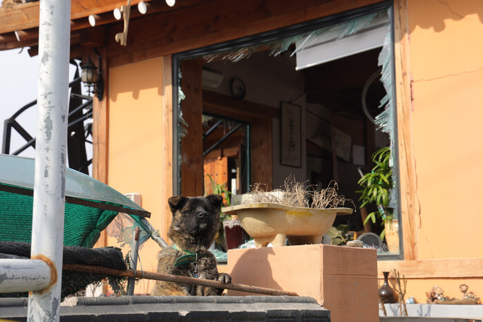 A dog looks from out behind a fence by a destroyed house at the site of an accidental fighter jet bombing over a village in Pocheon, some 40 kilometers north of Seoul, on March 7, 2025, one day after the Air Force's two KF-16 fighter jets mistakenly released eight MK-82 air-to-surface bombs outside a training range, leaving 15 civilians and 14 soldiers injured. (Yonhap)
