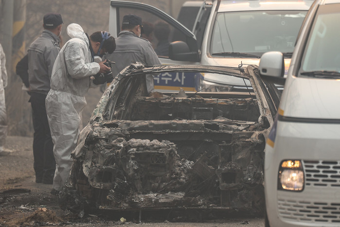 Police officers examine a burnt-out car on a road in Yeongdeok, North Gyeongsang Province, southeastern South Korea, on March 26, 2025, after three people were found dead in the car following a wildfire the previous day. (Yonhap)