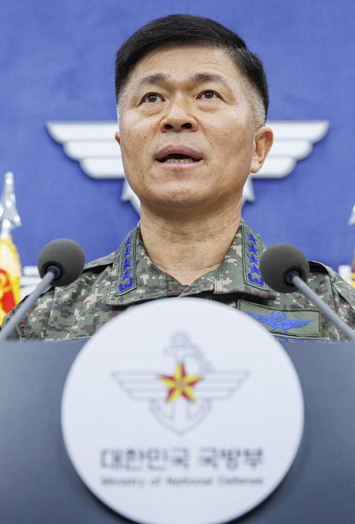 Air Force Chief of Staff Gen. Lee Young-su speaks during a press conference at the defense ministry in Seoul on March 10, 2025, over an accidental bombing of a civilian town on March 6. The Air Force reaffirmed pilot error as the main cause of the bombing in which two KF-16 fighter jets mistakenly released eight MK-82 air-to-surface bombs outside a training range, leaving 15 civilians and 14 soldiers injured. (Yonhap)