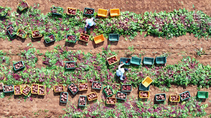 Farmers harvest beets in a field in the city of Jeju on South Korea's biggest island of the same name on June 27, 2025. (Yonhap)