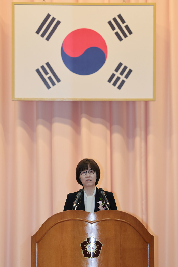 Lee Mi-son, outgoing justice of the Constitutional Court, attends a ceremony at the court in Seoul on April 18, 2025, to mark her departure from her post. (Yonhap)