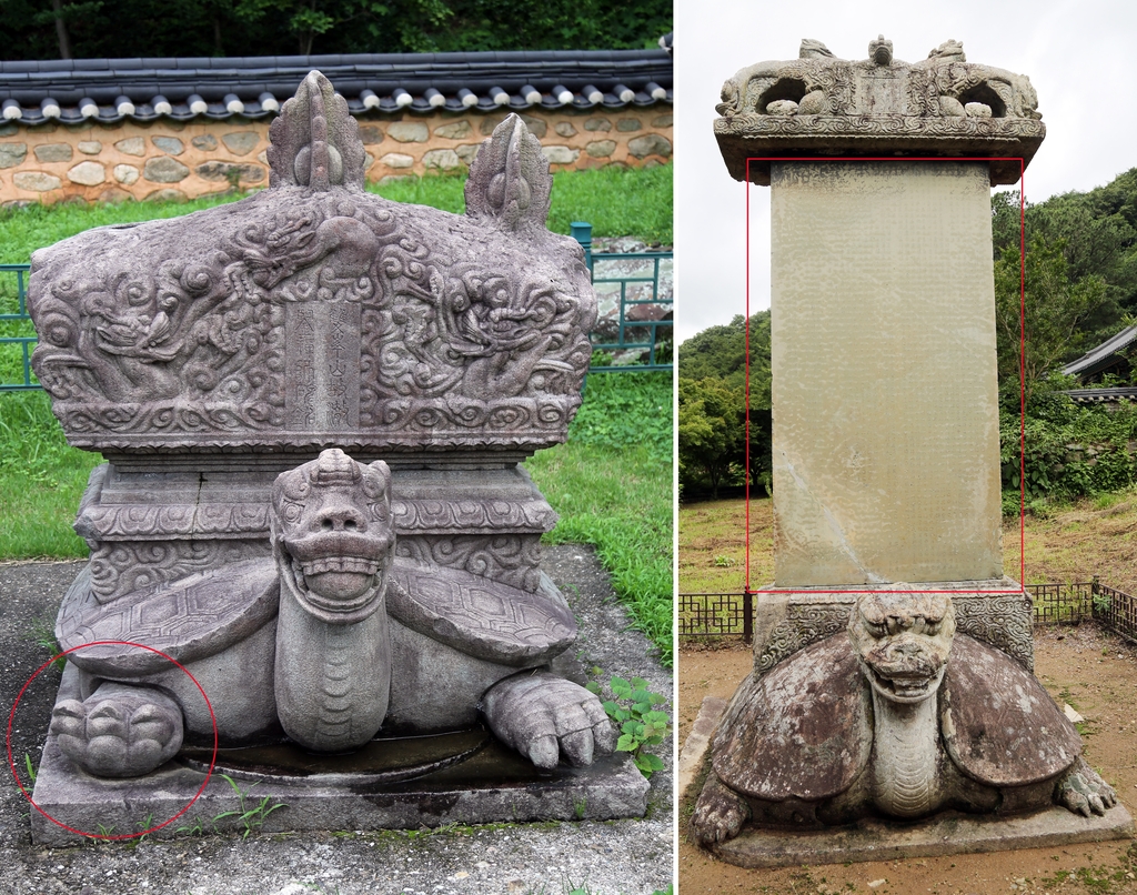 | ▲ 비석 없어진 쌍봉사 철감선사탑비…개성있는 오른발 (화순·장흥=연합뉴스) 이세원 기자 = 13일 전남 화순군 소재 쌍봉사에 있는 보물 철감선사탑비의 거북받침(왼쪽)에서 거북이 오른쪽 앞발(붉은 원)을 살짝 들고 있다. 같은 날 장흥 보림사에 있는 보조선사탑비(오른쪽)의 경우 거북이 좌우 앞발을 다 지면에 붙이고 있어 대비된다. 보림사 보조선사탑비는 거북이 비석(오른쪽 붉은 사각형)을 지고 있지만 쌍봉사 철감선사탑비의 경우 비석이 사라지고 없다. |