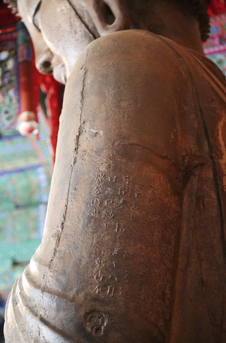 | ▲ 보림사 철조비로자나불좌상 왼팔에 새겨진 기록 [촬영 이세원] |