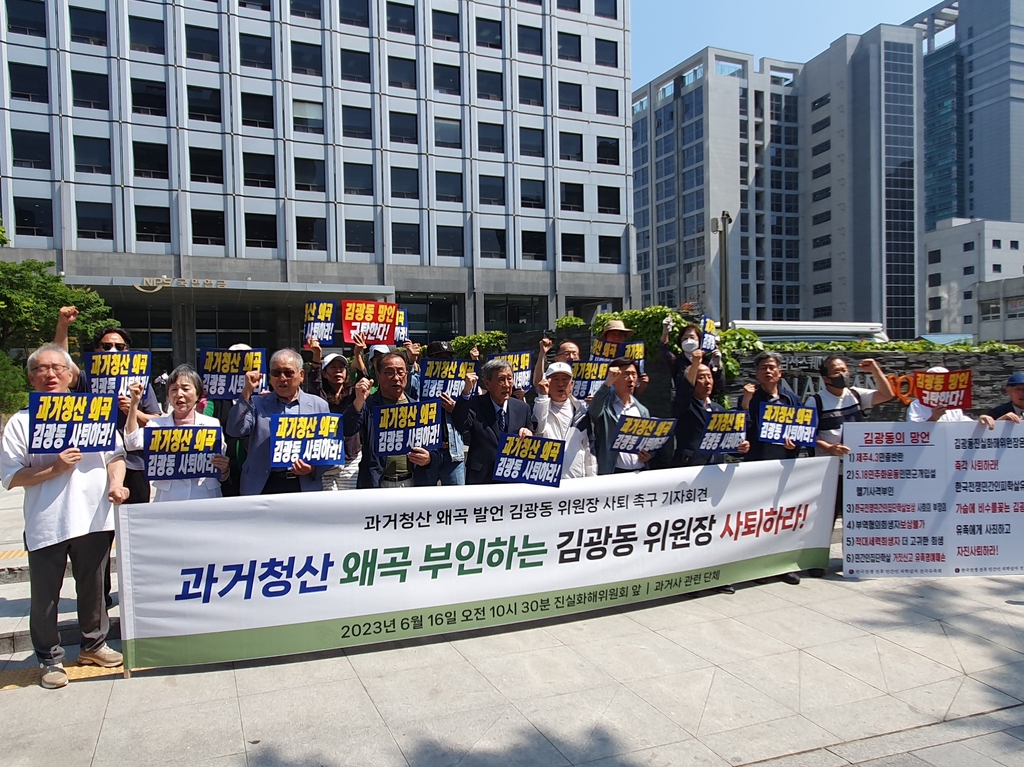 한국전쟁전후 민간인피학살자유족회 등은 16일 오전 서울 중구 진실화해위 앞에서 기자회견을 열어 "반인륜 국가 범죄를 옹호한 김 위원장은 스스로 물러나라"고 촉구했다.