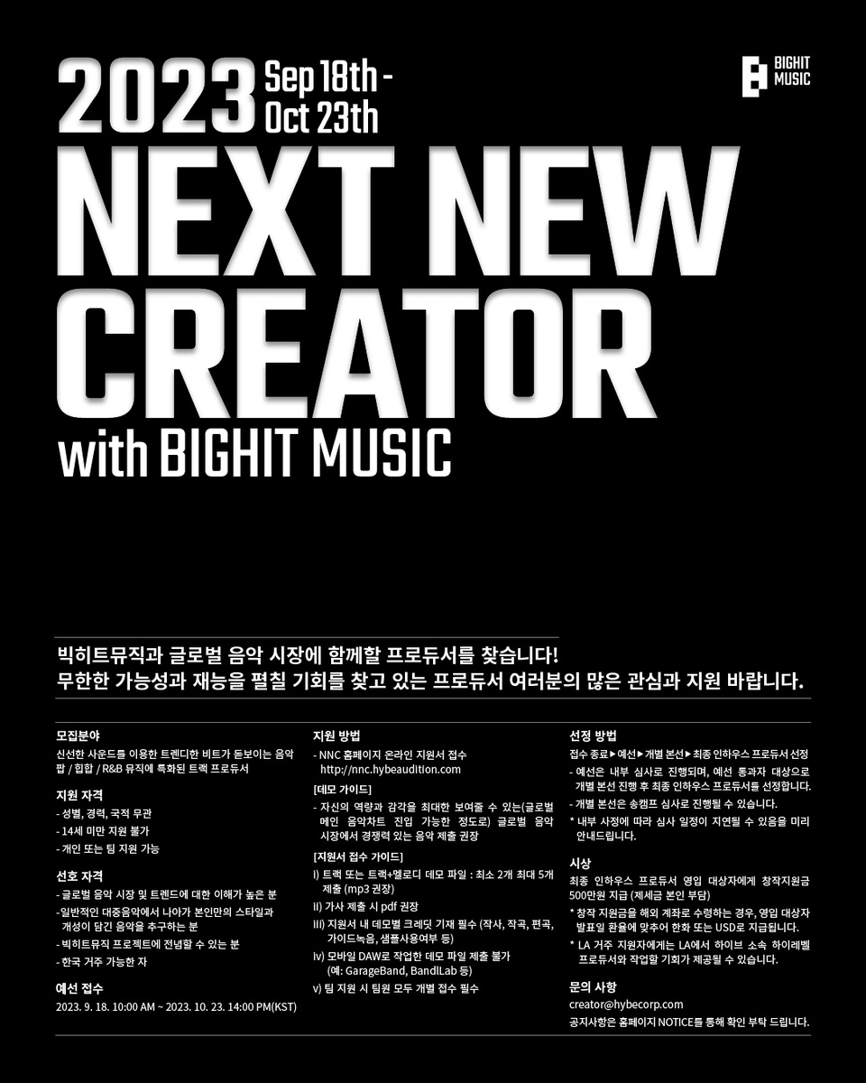 지원자는 데모 음악을 2∼5개 제출하면 된다. 선정된 개인과 팀은 창작 지원금 500만원을 받을 수 있고, 빅히트뮤직(하이브) 영입 기회도 얻을 수 있다.