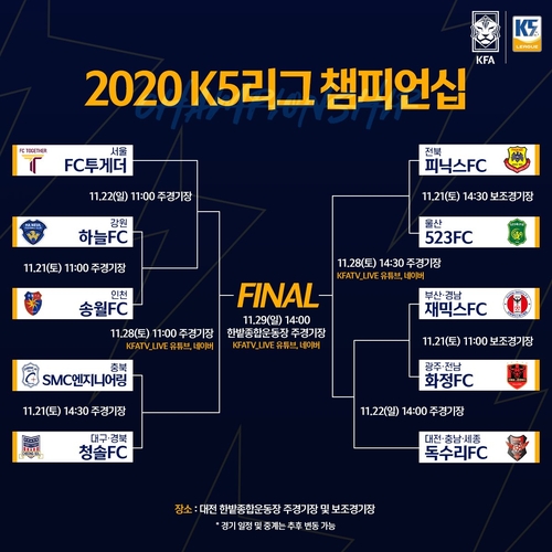 (서울=연합뉴스) 장보인 기자 = 생활축구 K5리그의 최강자를 가리는 '2020 K5리그 챔피언십'이 이달 21일부터 29일까지 대전광역시 한밭종합운동장에서 열린다.