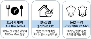 CJ제일제당은 이를 토대로 올해 식문화 트렌드로 ▲ 탈(脫) 삼시세끼 ▲ 신(新) 집밥 ▲ MZ 세대(1980년대∼2000년대 초반 출생 세대) 쿠킹 등 세 가지를 제시했다.