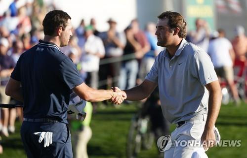 | ▲ 승자와 패자. 연장전을 마치고 캔틀레이(왼쪽)과 악수하는 셰플러. [AP=연합뉴스] |