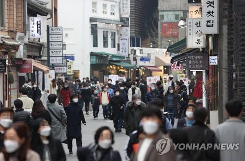 | ▲ This photo, taken on Feb. 14, 2021, shows a crowded street in central Seoul during the Lunar New Year holiday. The extended holiday ran from Feb. 11-14 this year. (Yonhap) |