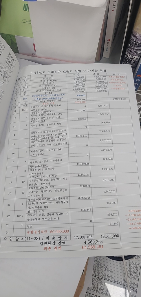 | ▲ 2018년 빗내농악 보존회 결산서 [독자 제공. 재판매 및 DB 금지] |