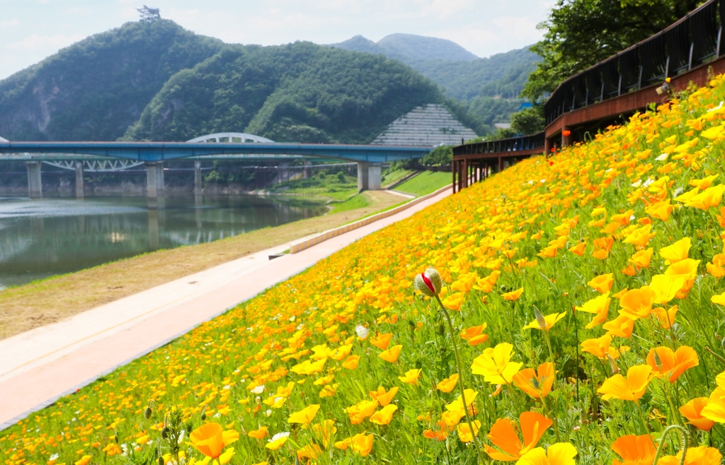 [픽! 단양] 단양강 수변 수놓은 금영화·꽃양귀비 장관
