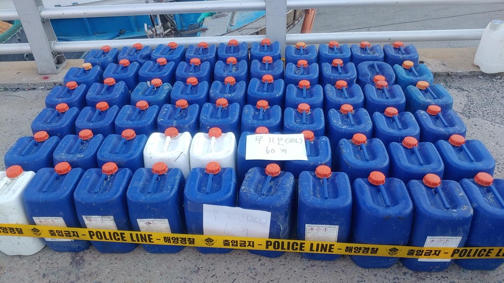 이 어선은 전날 오전 11시 20분께 서천군 다사항 인근 해상에서 무기산으로 추정되는 유해물질 1천200ℓ를 실은 채 항해하다 신고를 받고 출동한 해경에 적발됐다.