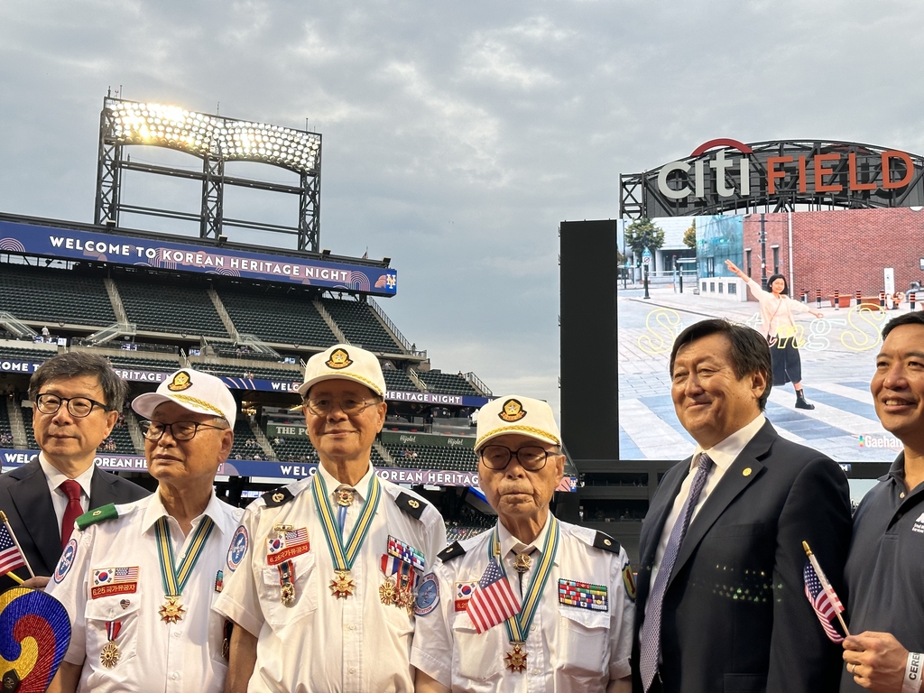 | ▲ 뉴욕 메츠 한국의 밤 행사에 초청된 참전용사 (뉴욕=연합뉴스) 이지헌 특파원 = 14일(현지시간) 뉴욕 메츠 홈구장에서 열린 '2023 한국의 밤' 행사에서 6·25참전용사와 김의환 주뉴욕총영사(왼쪽 첫번째), 김광석 뉴욕한인회장(오른쪽 두번째), 케빈 김 뉴욕시 스몰비즈니스서비스국(SBS) 커미셔너 등 참석자들이 기념촬영을 하고 있다. 2023.8.15 photo@yna.co.kr |