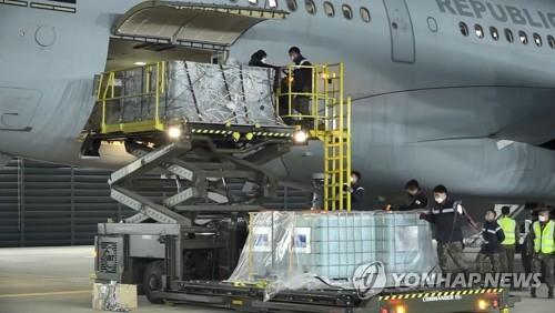 | ▲ Workers unload boxes of aqueous urea solution from the Air Force's KC-330 tanker aircraft at Gimhae International Airport in the southeastern city of Busan on Nov. 11, 2021, in this photo provided by the Air Force. The plane brought 27,000 liters of urea solution from Australia as part of government efforts to ease a supply shortage of the key additive for diesel vehicles. (PHOTO NOT FOR SALE) (Yonhap) |