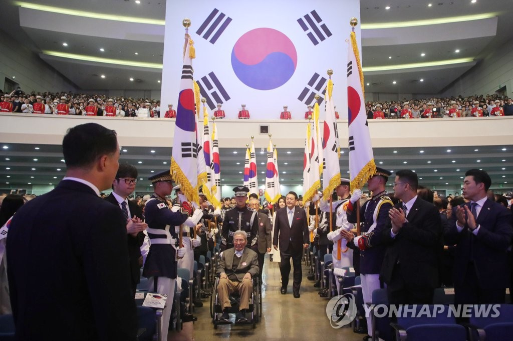 | ▲ 애국지사와 함께 입장하는 윤석열 대통령 (서울=연합뉴스) 진성철 기자 = 윤석열 대통령과 김건희 여사가 15일 서울 서대문구 이화여대 대강당에서 열린 제78주년 광복절 경축식에 오성규, 김영관 애국지사와 함께 입장하고 있다. 2023.8.15 [대통령실통신사진기자단] zjin@yna.co.kr |