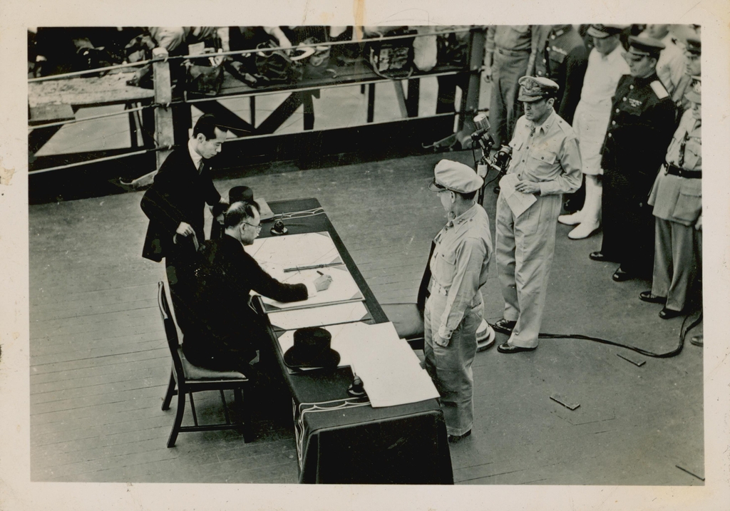 | ▲ 일제의 항복 서명 시게미쓰 마모루(重光葵·1887~1957)가 1945년 9월 2일 항복 서명을 하는 모습을 촬영한 사진 [독립기념관 제공. 재판매 및 DB 금지] |