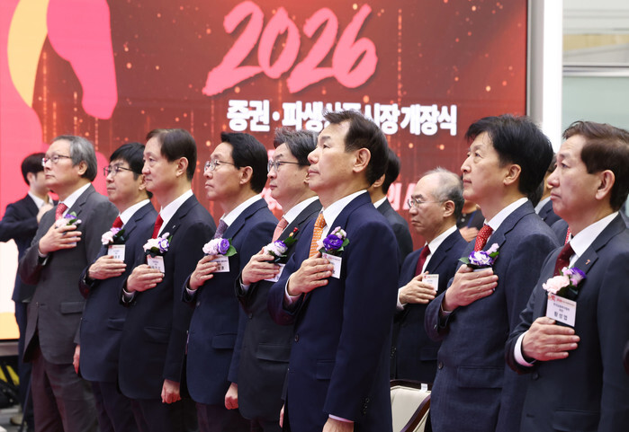 Jeong Eun-bo (6th from L), president of the Korea Exchange, and others take part in a ceremony at the bourse in Seoul on Jan. 2, 2026, to mark the start of business for the new year at South Korean securities and derivative markets. (Yonhap)