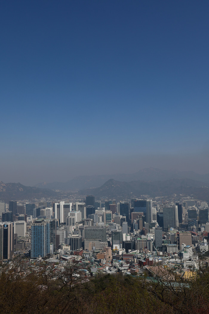This photo taken from Mount Nam in Seoul on April 11, 2025, shows the landscape of the South Korean capital blanketed in haze, as the atmospheric levels of PM2.5, harmful particles smaller than 2.5 microns in diameter, are forecast to remain "bad." (Yonhap)