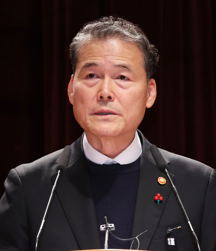 Unification Minister Kim Yung-ho, South Korea's point man on inter-Korean relations, speaks during a ceremony to mark the start of business for the new year at the government complex in Seoul on Jan. 2, 2025. (Yonhap)
