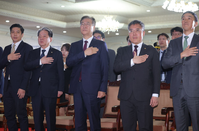 Justice Minister Park Sung-jae (C) salutes the national flag during a ceremony to mark the 62nd anniversary of Law Day at the government complex in Gwacheon, south of Seoul, on April 25, 2025. (Yonhap)