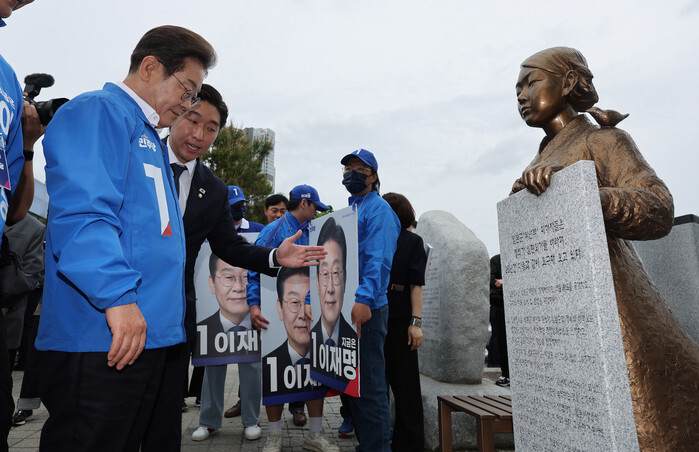 Lee Jae-myung, the presidential candidate of the liberal Democratic Party, views a statue of a girl symbolizing "comfort women," who were forced to work in Japanese wartime military brothels, as he makes a campaign stop in Iksan, North Jeolla Province, southwestern South Korea, on May 16, 2025, ahead of the June 3 presidential election. (Pool photo) (Yonhap)