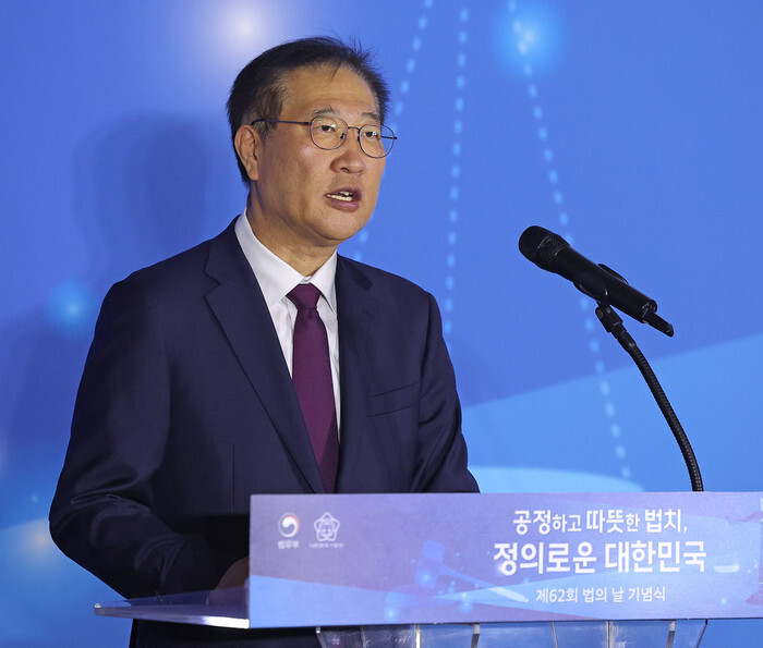 Justice Minister Park Sung-jae speaks during a ceremony to mark the 62nd anniversary of Law Day at the government complex in Gwacheon, south of Seoul, on April 25, 2025. (Yonhap)