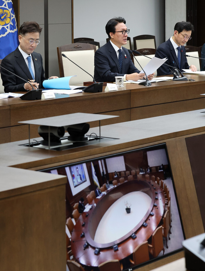 Prime Minister Kim Min-seok (C) presides over a coordination meeting with related ministers to discuss key state affairs at the government complex in Sejong, central South Korea, on Dec. 24, 2025. (Yonhap)