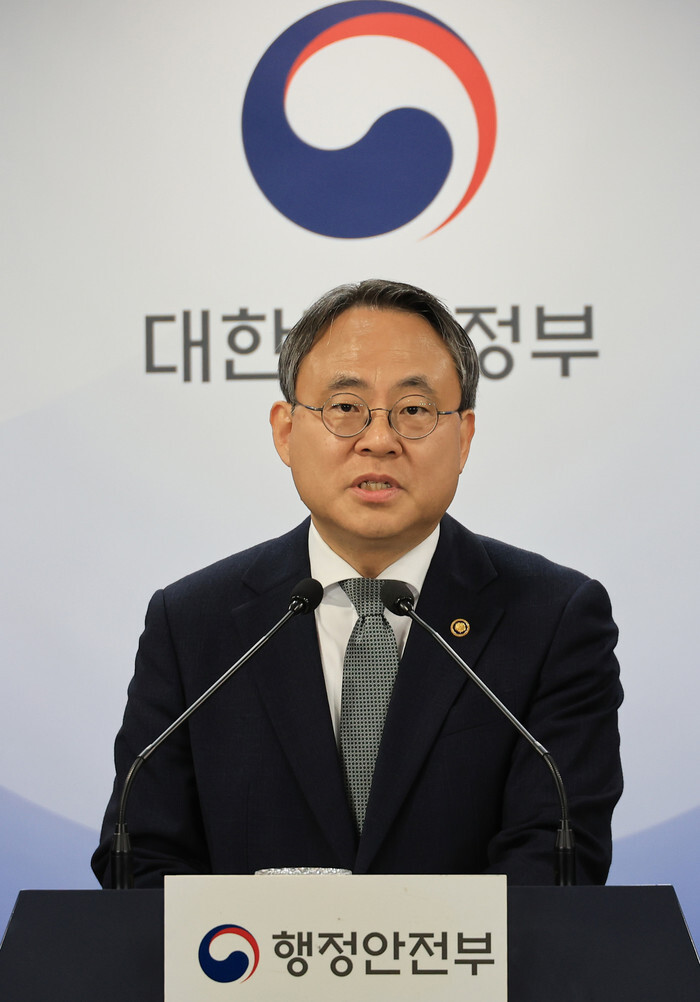Acting Interior and Safety Minister Ko Ki-dong attends a press conference at the government complex in Seoul on April 8, 2025, after the government formally designated June 3 as the date of the next presidential election following the ouster of former President Yoon Suk Yeol. (Yonhap)