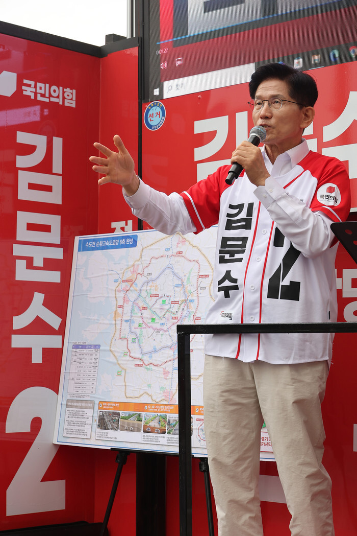 Kim Moon-soo, the presidential candidate of the conservative People Power Party, makes a stump speech in front of a train station in Hwaseong, south of Seoul, on May 16, 2025, ahead of the June 3 presidential election. (Yonhap)