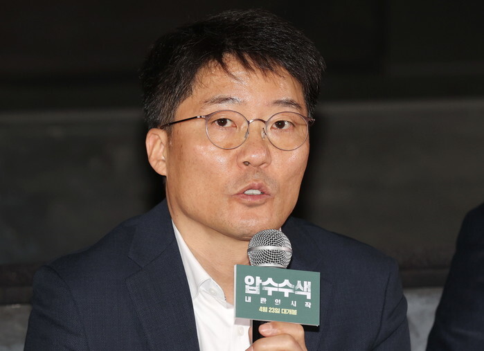 Han Sang-jin, a reporter of online news outlet Newstapa, speaks during a publicity event in Seoul on April 14, 2025, to promote the documentary film "Search and Seizure: The Rise of an Insurrection." The movie will be released in South Korea on April 23. (Yonhap)