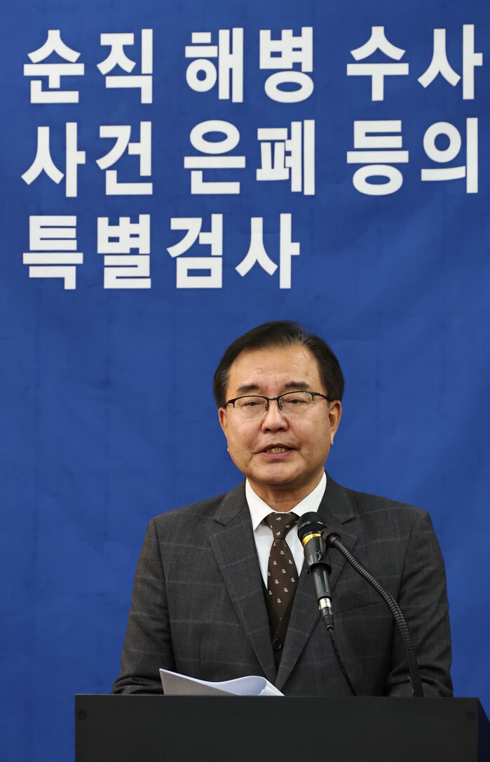 Special counsel Lee Myeong-hyeon attends a press conference at the office of his team in Seoul on Nov. 28, 2025, to announce the outcome of its 150-day investigation into the government's alleged interference in a military probe into the death of a young Marine in 2023. (Yonhap)